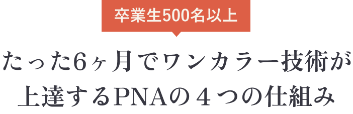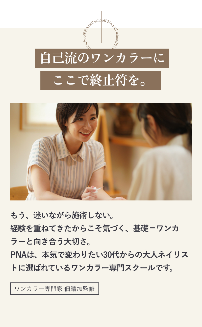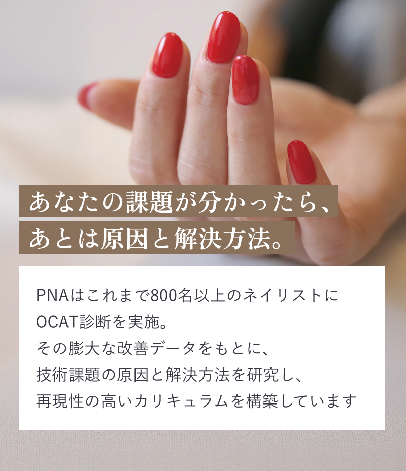 サロン勤務で技術を教えてもらえる環境がない、自宅サロンで技術を見てもらう人がいないという方が多いためPNAではマンツーマンレッスンや6ヶ月集中レッスンで認定インストラクターによる直接指導で徹底サポートします。詳しくは詳しくはこちらのページをご覧ください。
